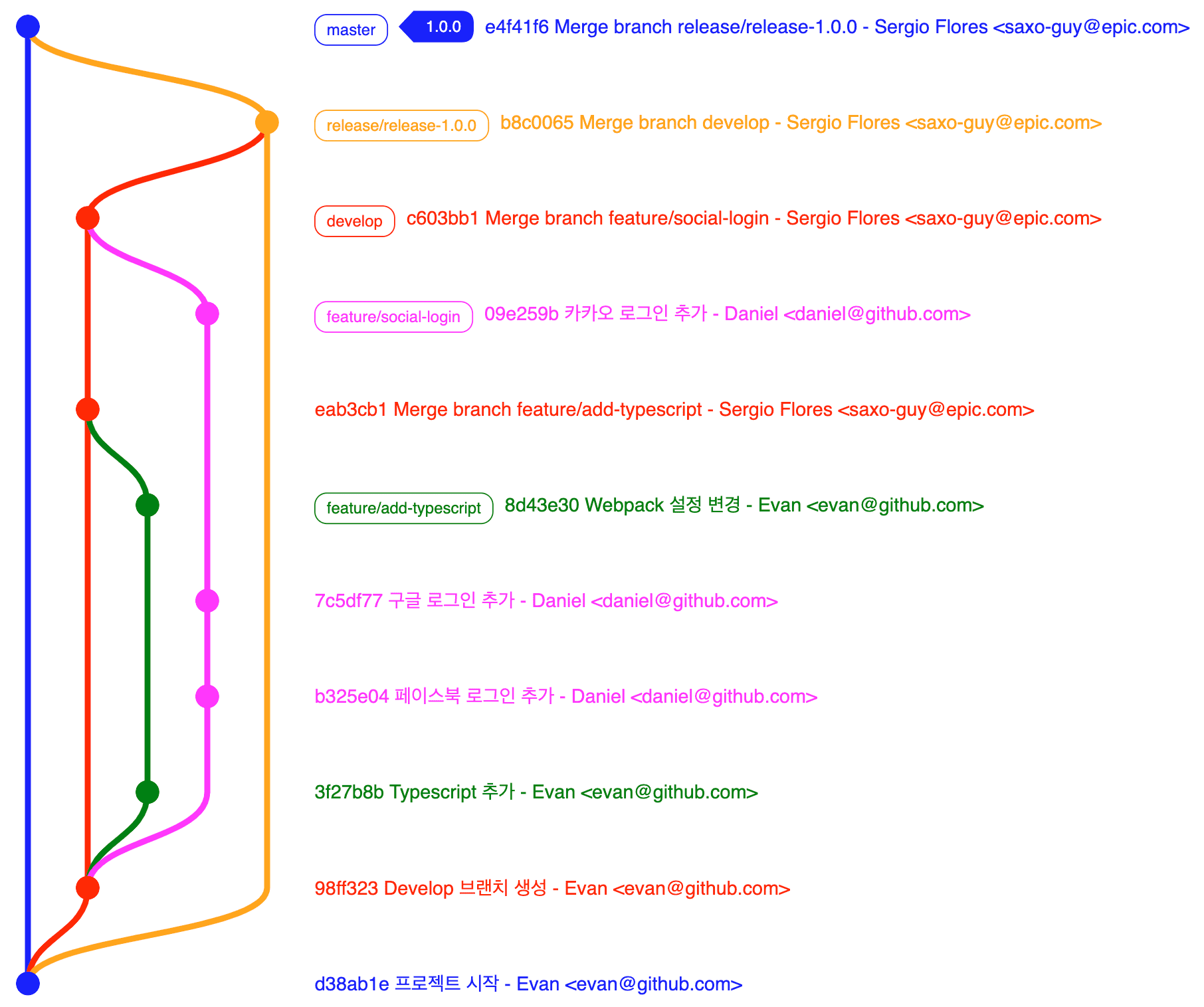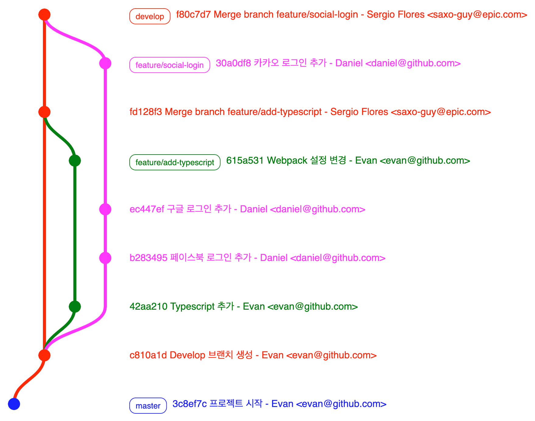 에반은 feature/add-typescript 브랜치를 생성한 후 어플리케이션에 타입스크립트를 붙히는 작업을 하고, 다니엘은 feature/social-login 브랜치를 생성한 후 소셜 로그인 연동 작업을 하고 있다. 그 후 개발이 끝나는 대로 develop 브랜치에 해당 브랜치들을 차례로 머지하고 있는 모습을 볼 수 있다.