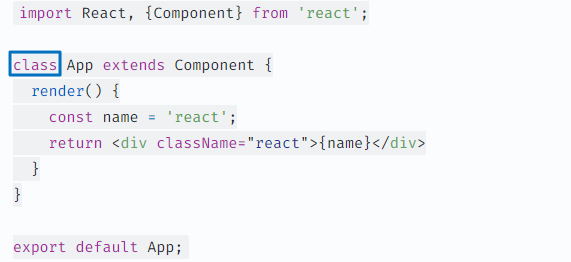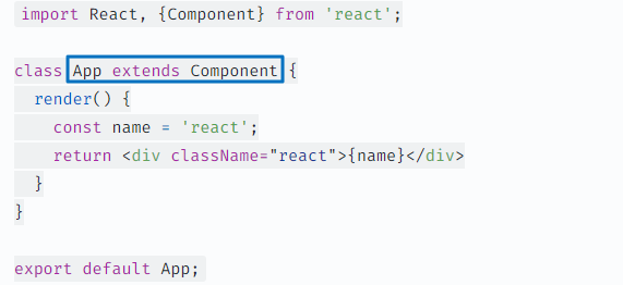 import React, {Component} from 'react'; class App extends Component { render() { const name = 'react'; return <div className="react">{name}</div> } } export default App;클래스 컴포넌트 핵심