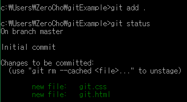 어? 이제 초록색으로 git.html이 표시되네요? 마음이 편해집니다. new file: git.html 이라고 commit될 대기 중임을 알려줍니다. 이 상태로 commit을 하면 아직 git.css는 저장되지 않습니다. add하지 않았기 때문이죠. 이제 git.css도 git add git.css로 저장해줍니다.