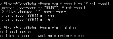 First commit이라는 설명으로 commit을 해봤습니다. 밑에 commit에 대한 설명이 나오는 데 2개의 파일이 바뀌었고, 17줄이 새로 추가되었다고 나오네요. 그 후 다시 git status를 했더니 이제 빨간색도, 초록색도 나오지 않습니다. 모두 다 저장되었음을 알 수 있습니다.