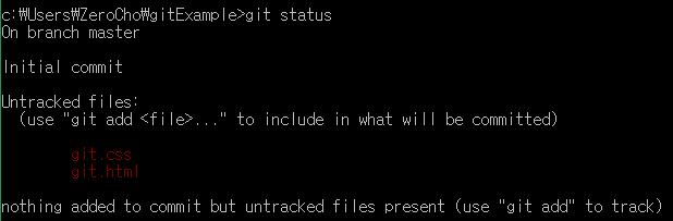 그리고 Untracked files: git.css, git.html 이라고 되어있습니다. 여기서부터가 중요합니다. 무시무시하게 빨간색으로 되어 있죠? 저렇게 빨간색으로 되어있으면 저 파일은 commit되지 않습니다. 위에 설명을 보니까 commit 대상에 포함시키려면 git add [파일 이름]을 하라고 나와있네요.