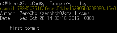 마지막으로 commit된 내역을 볼 수 있는 명령어 git log입니다.