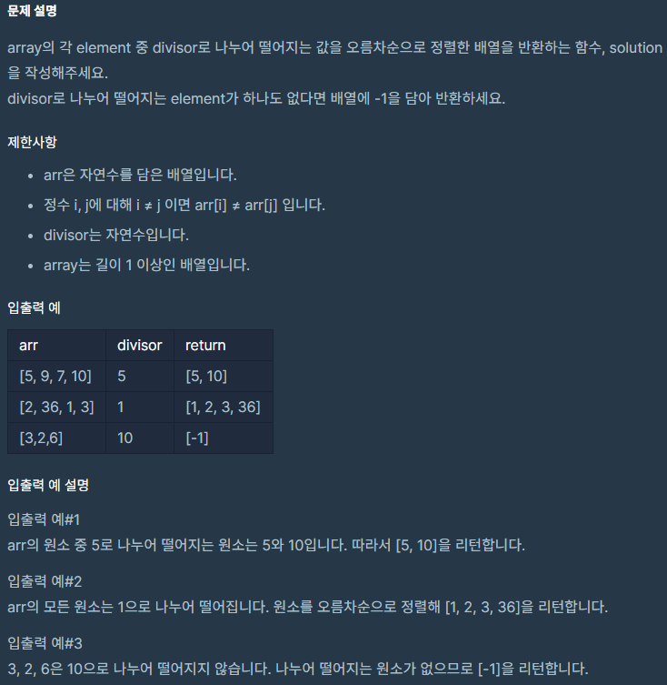 array 안에 자연수 element들이 있는데 그걸 divisor로 나눴을 때 나눠진다면 그 element를 리턴해야 돼!